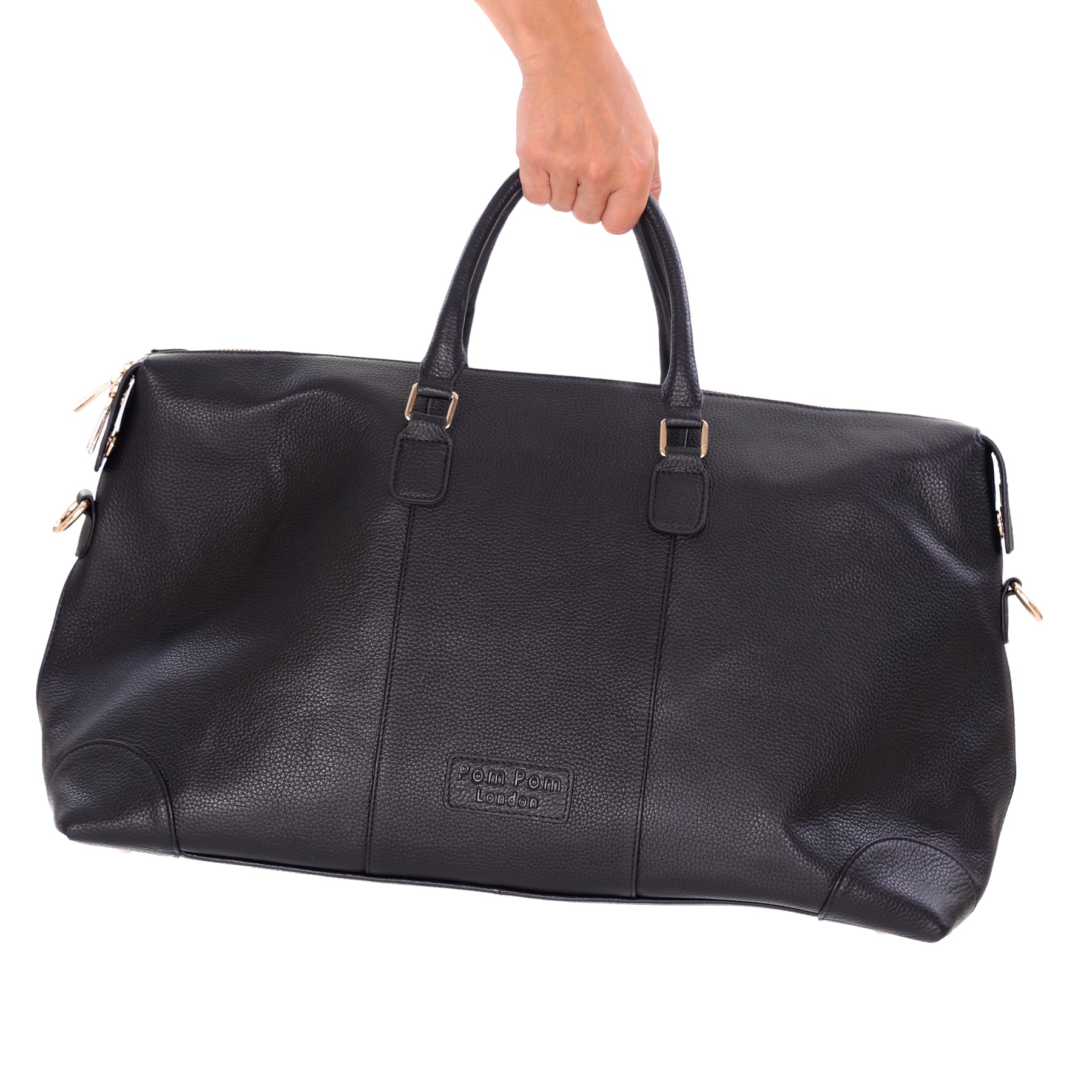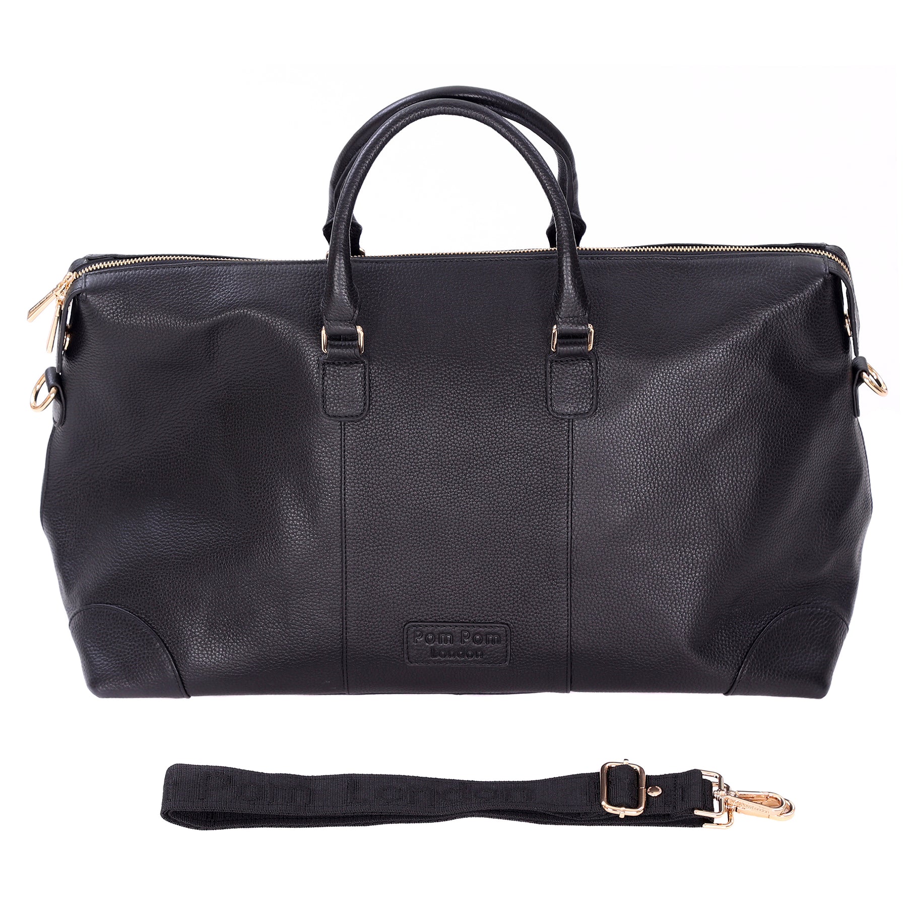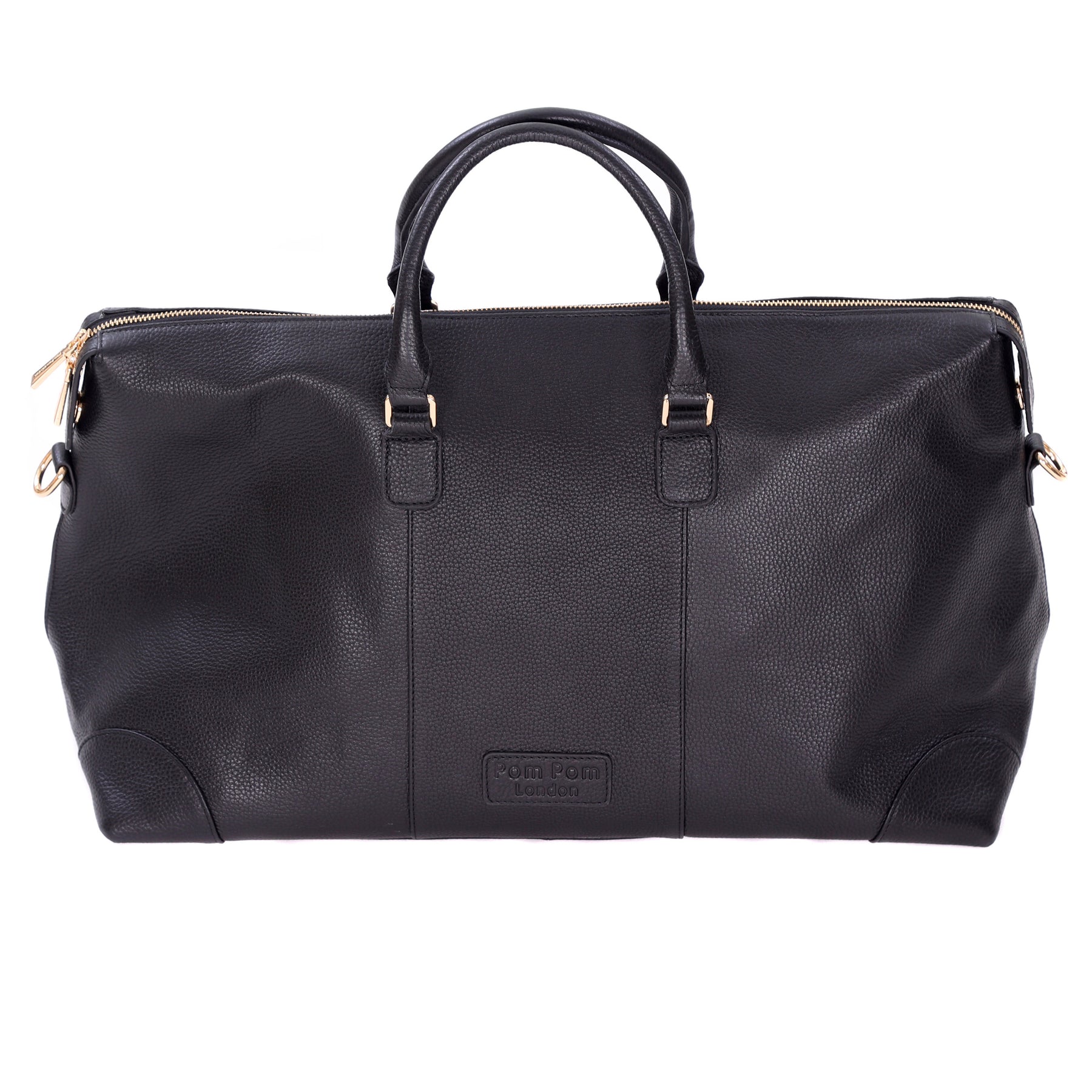 Introducing the Pom Pom London Weekend Bag in Black. Made from lined pebble grain leather, it features soft top roll handles and a detachable fabric crossbody strap. This is the ultimate leather weekend bag for a trip to the gym, a night away, or a weekend visit.
