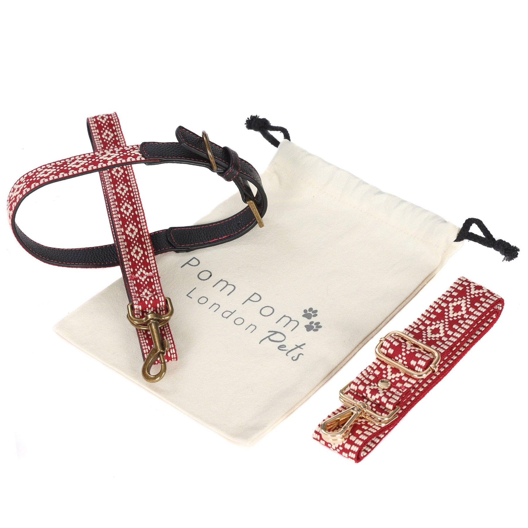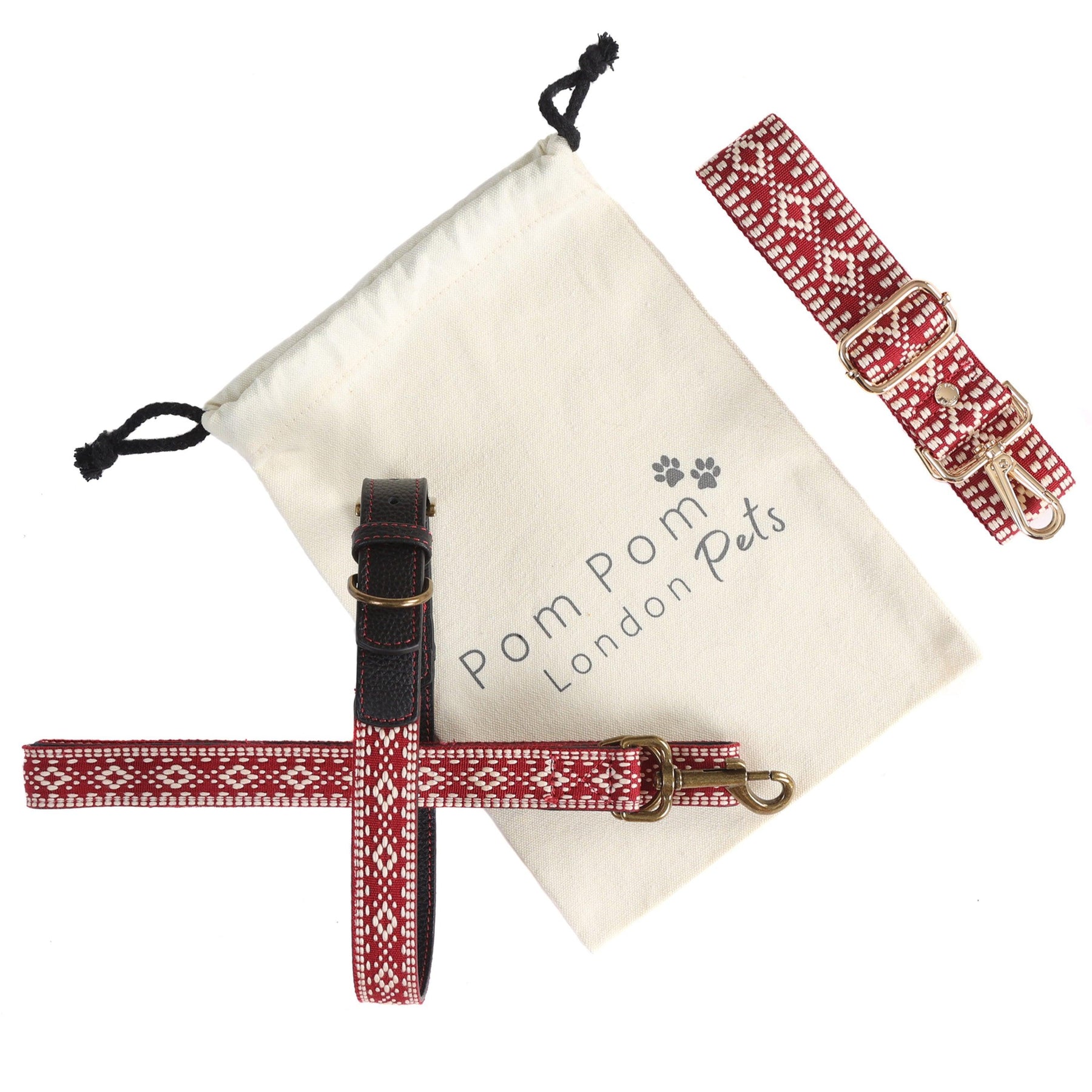 The Pom Pom London Collar and Lead Set in Cranberry is a must for pet-lovers. These sets are handcrafted using a soft wipe clean webbing with a backing of the same premium leather used in our handbags. The collar has reinforced leather at each end with Pom Pom London smartly debossed leaving the main part flexible and soft enough to provide comfort to your pet. The lead is the same allowing flexibility and comfort for the handler as well as having reinforced leather where it connects to the collar for security. All the hardware is zinc alloy with a brushed antique brass finish.