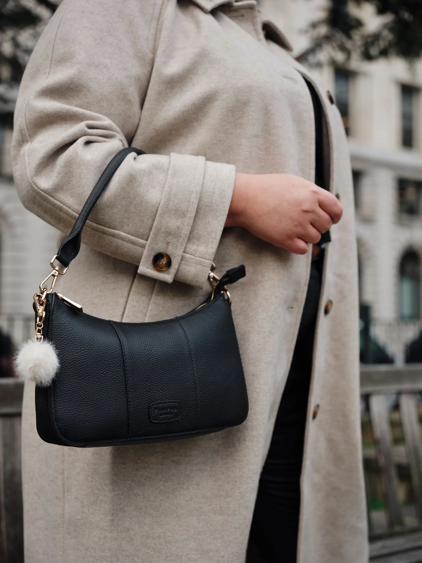 • Pom Pom London Edgware Bag in Black - A slim, structured shoulder bag with timeless appeal.