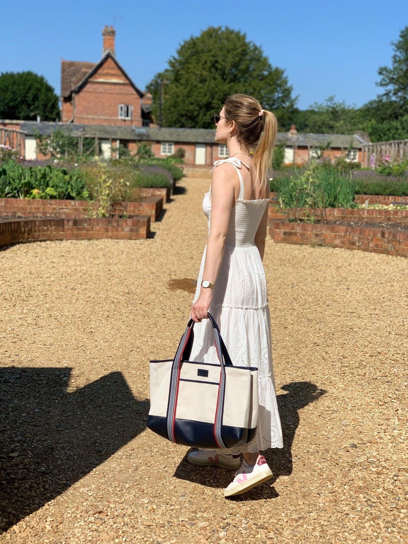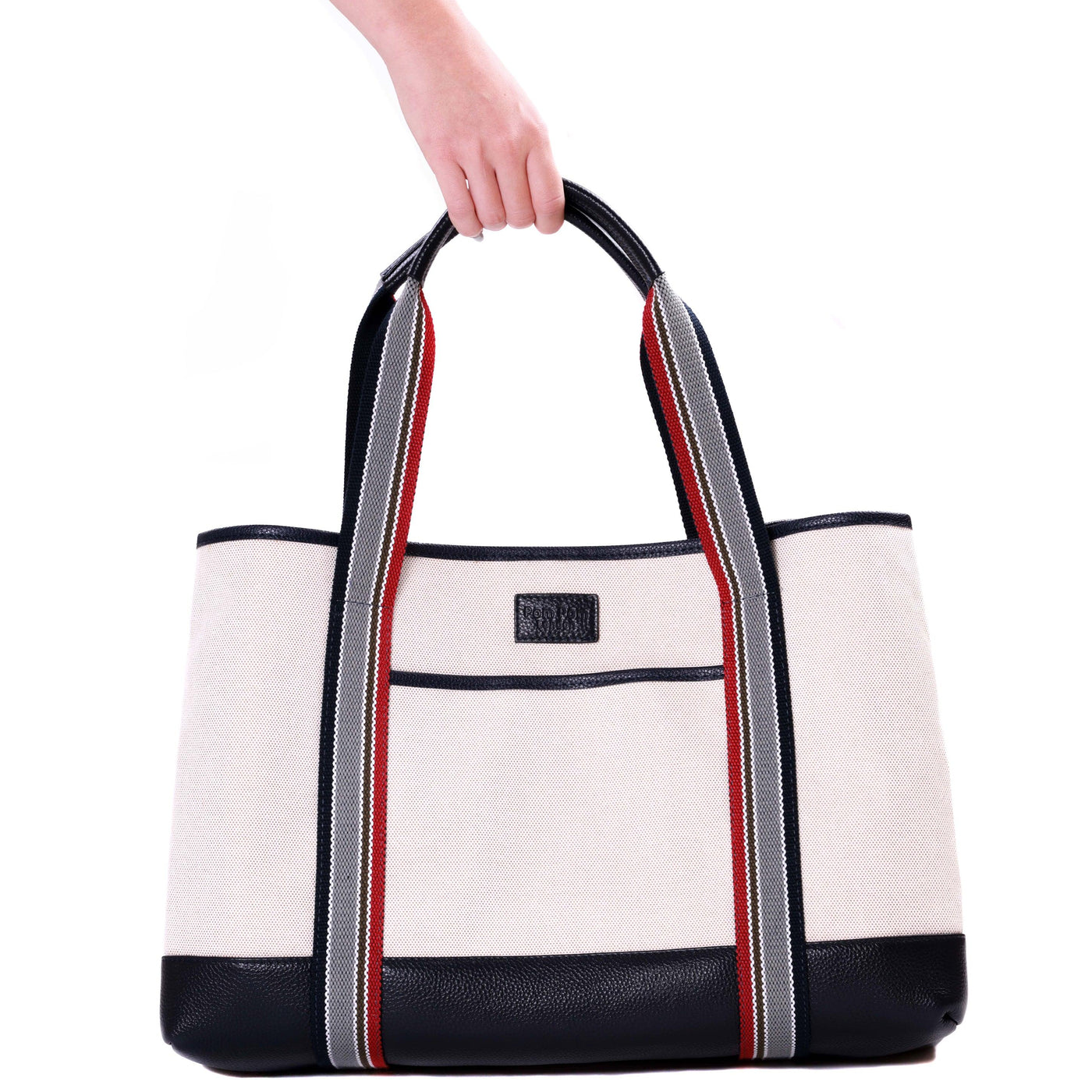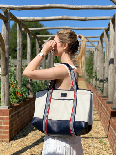 Introducing the Padstow Tote Bag Navy. Perfect for around town, going to the beach or as a carry on flight bag. Made in a wipe down canvas and edged in leather it is a perfect allrounder.