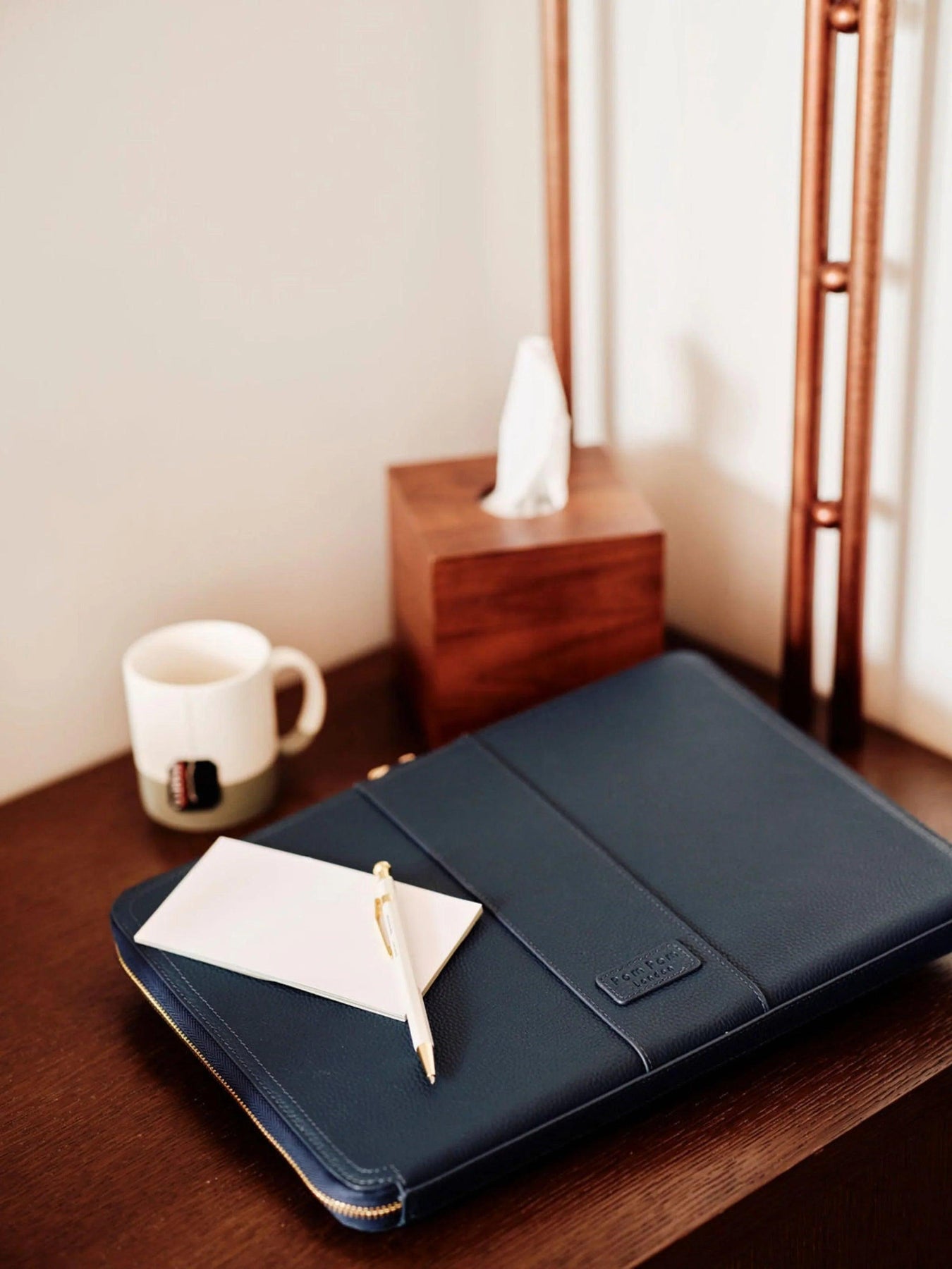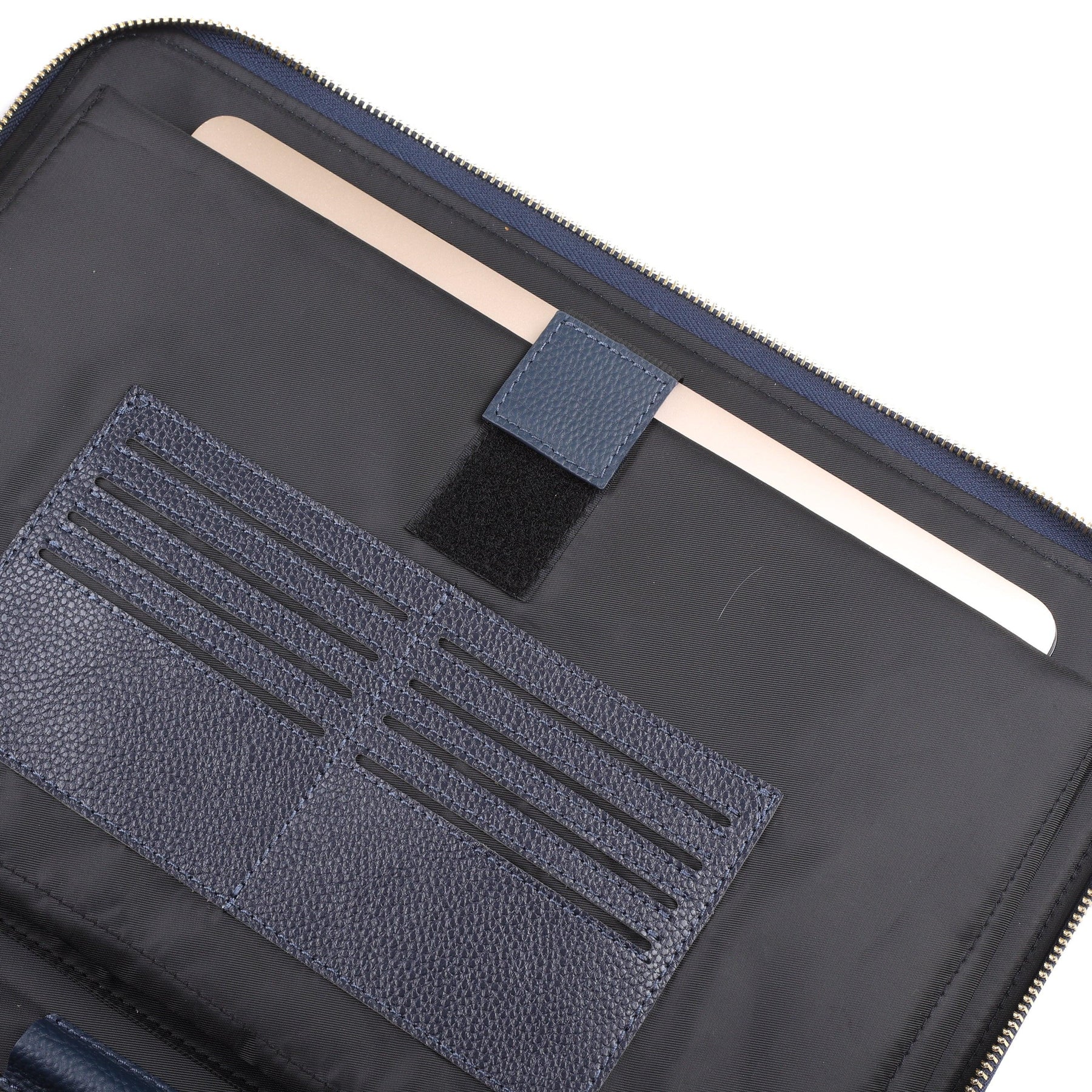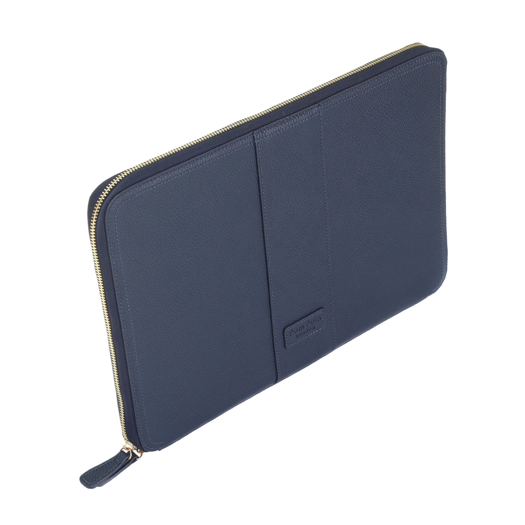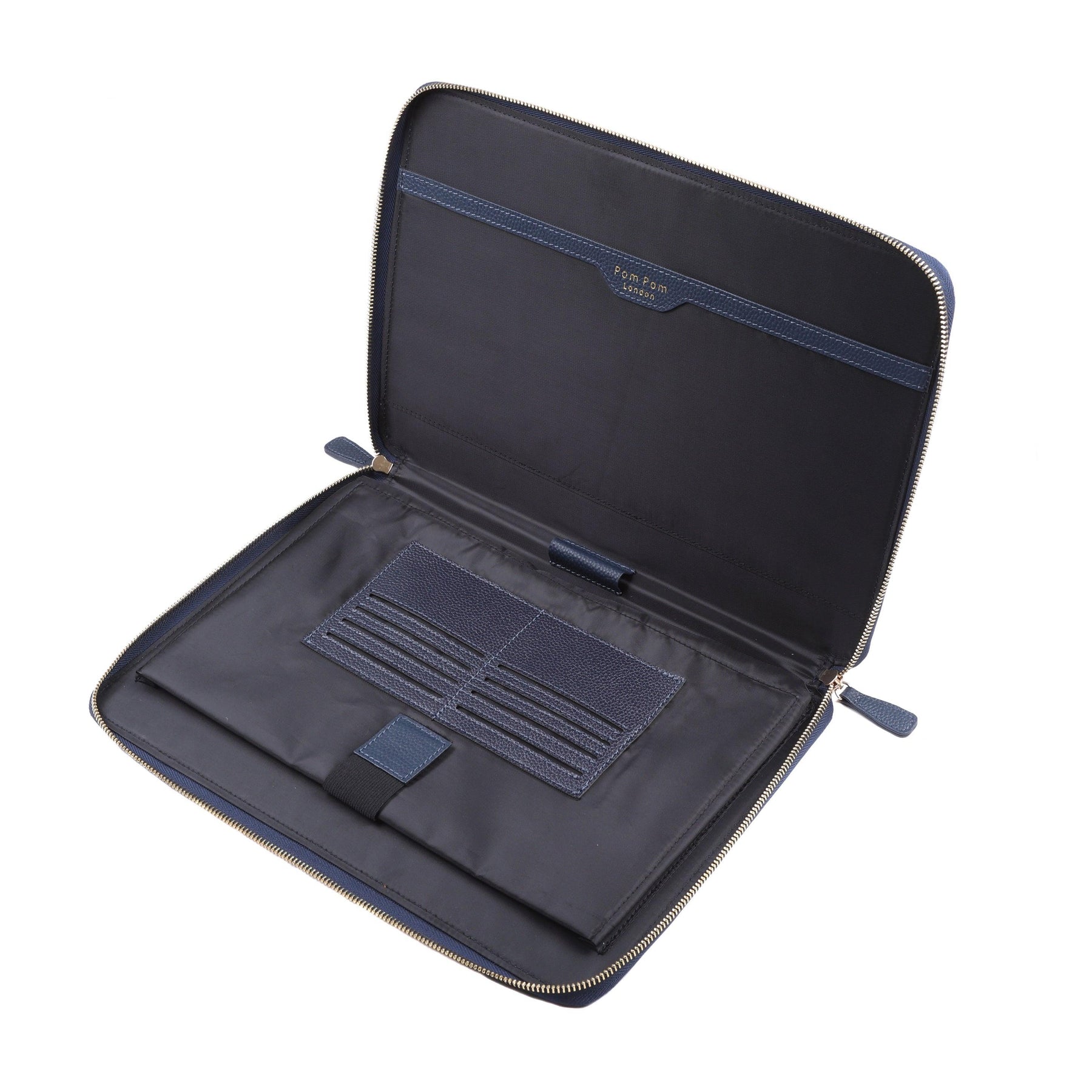 Introducing the NEW Pom Pom London Laptop Sleeve Denim Blue. This has been designed to fit up to a 14" laptop and includes useful internal organisation compartments such as a sleeve opening, card organiser, pen holder and a soft padded laptop pocket with a secure extendible velcro fastening. It has 2 leather zip pulls which when fully unzipped lays flat.