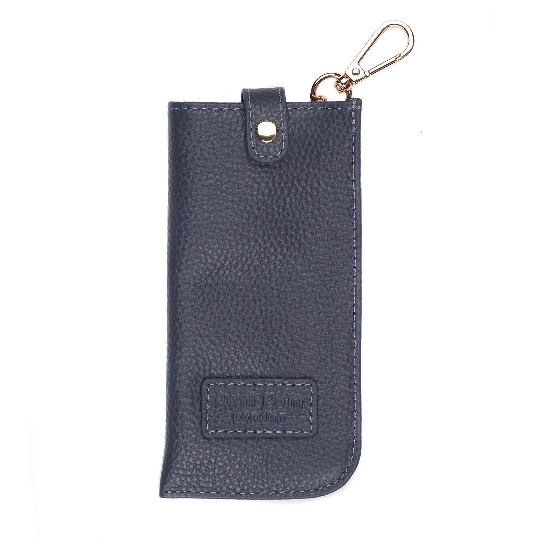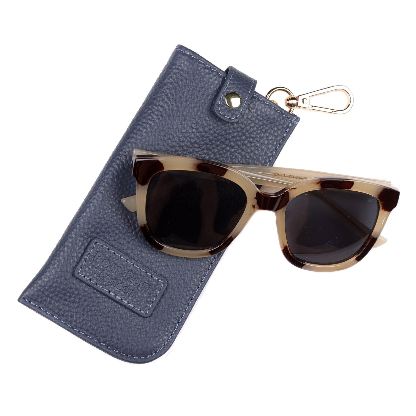 Introducing the Pom Pom London Glasses Case Slate Blue, the ultimate accessory for any of our bags. This simple design in leather with a premium lining is the perfect home for your glasses. The case also features a security popper at the top to keep your glasses secure, as well as a clip to attach to your bag.