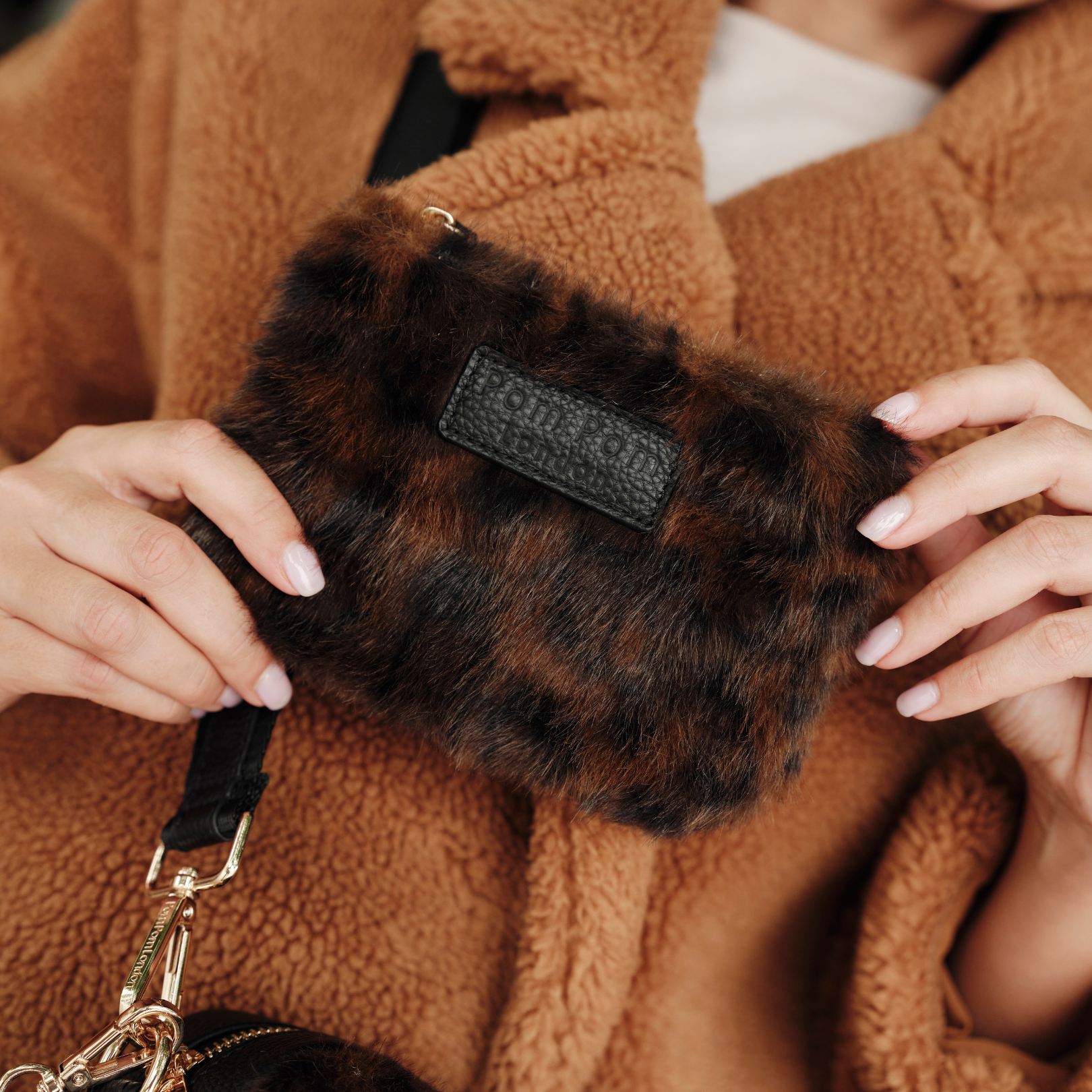 • Pom Pom London City Plus Bag Leopard Print Faux Fur Bundle in Black - A stylish leather crossbody with faux fur texture.