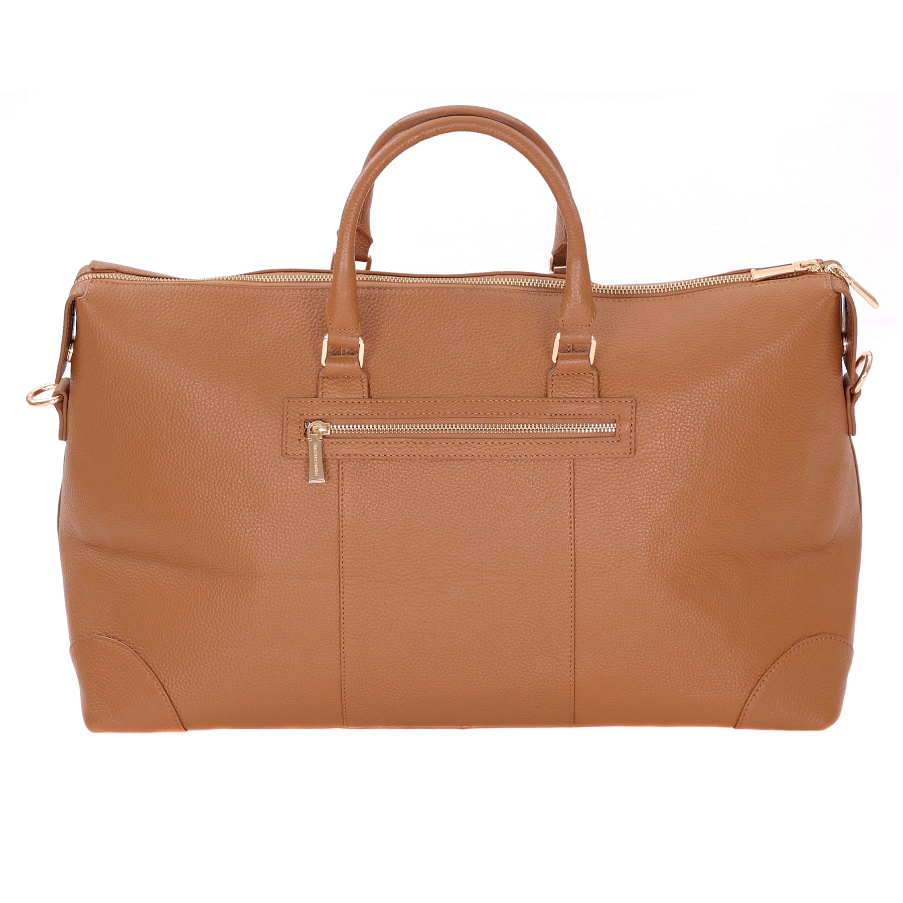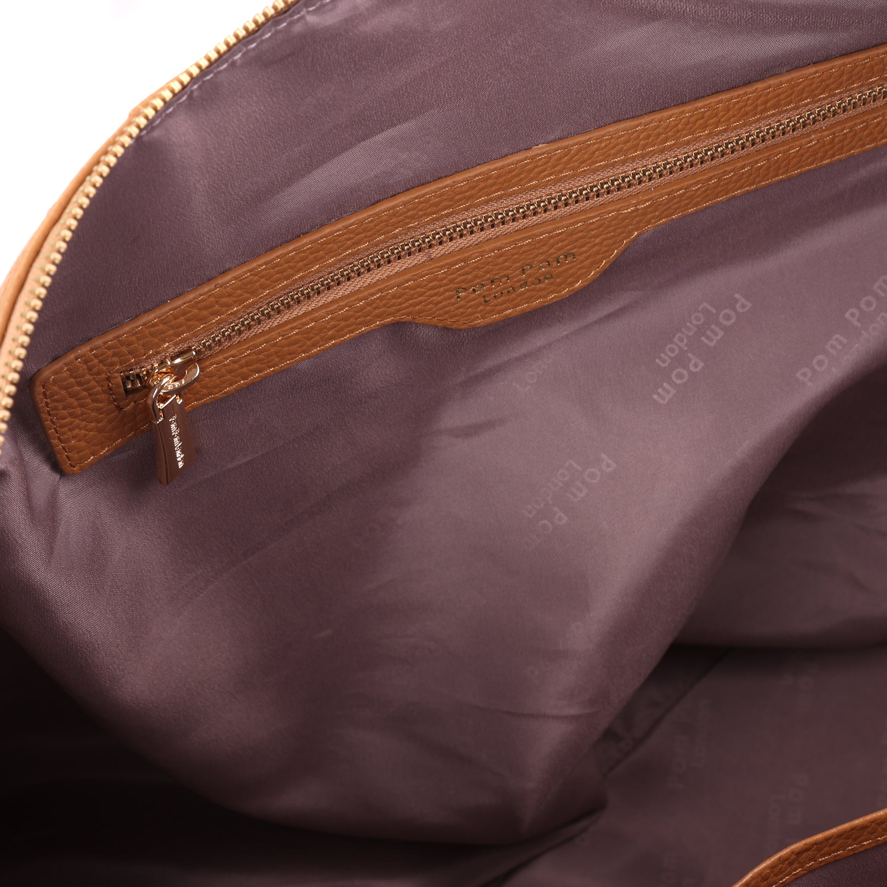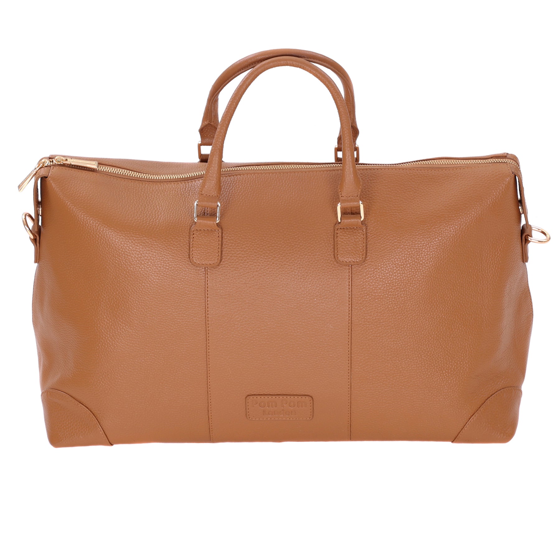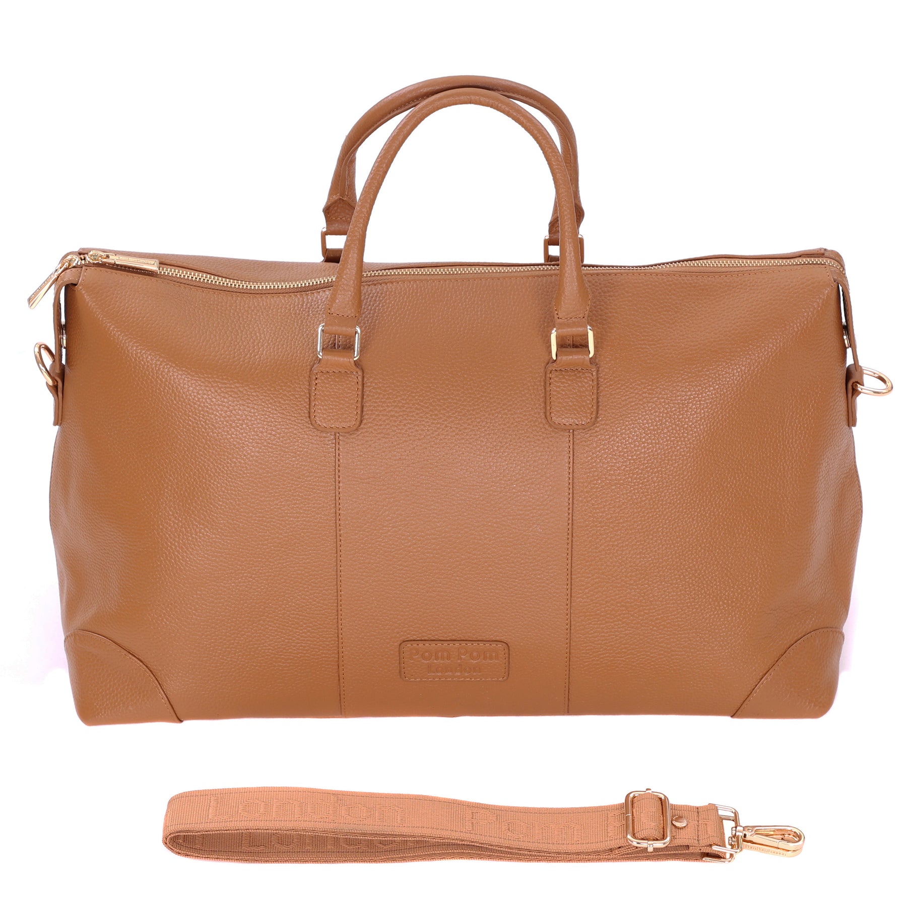 Introducing the Pom Pom London Weekend Bag in Maple. Made from lined pebble grain leather, it features soft top roll handles and a detachable fabric crossbody strap. This is the ultimate leather weekend bag for a trip to the gym, a night away, or a weekend visit.