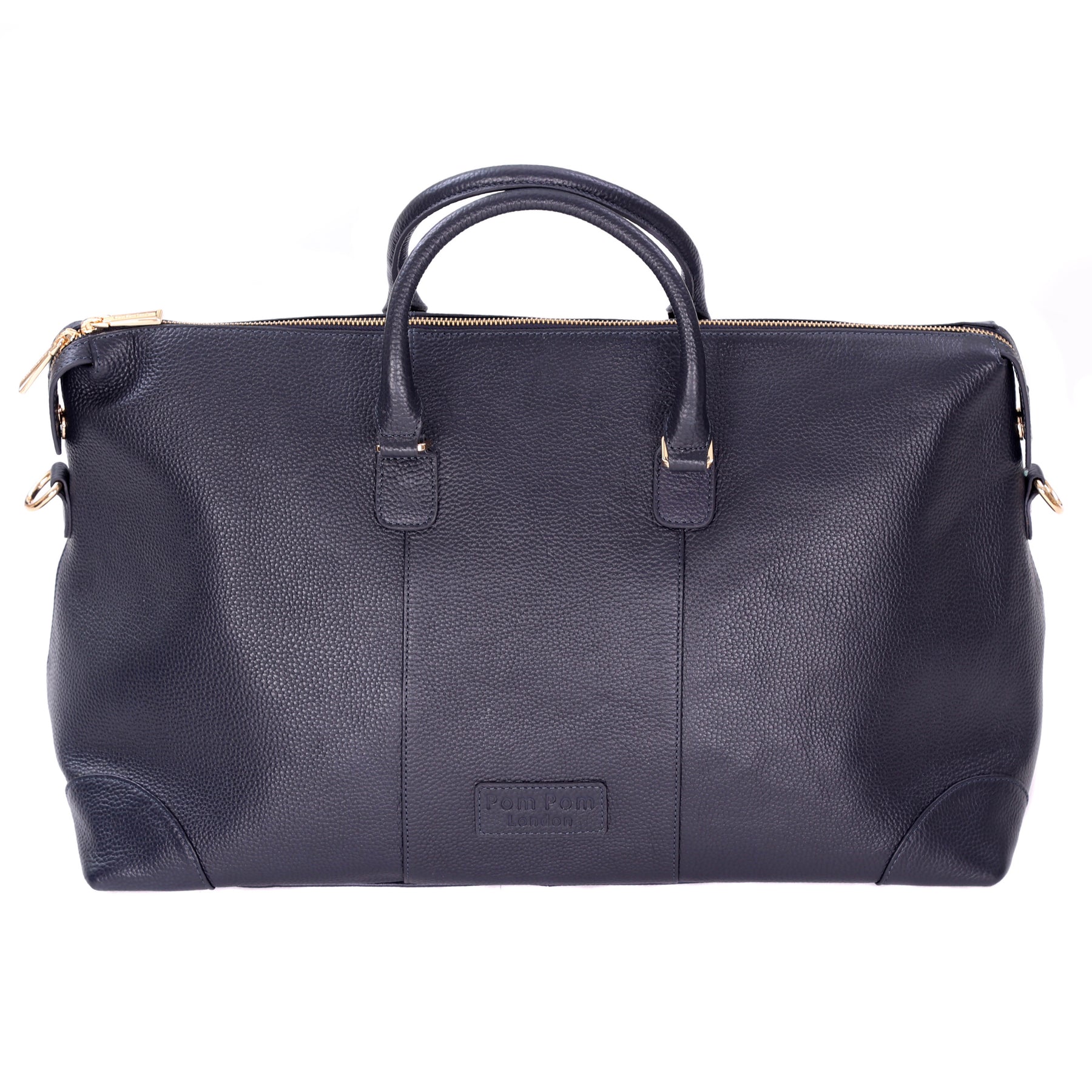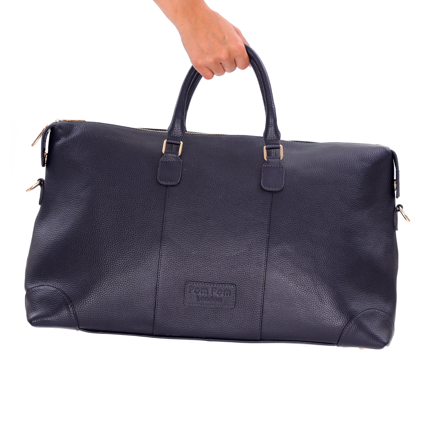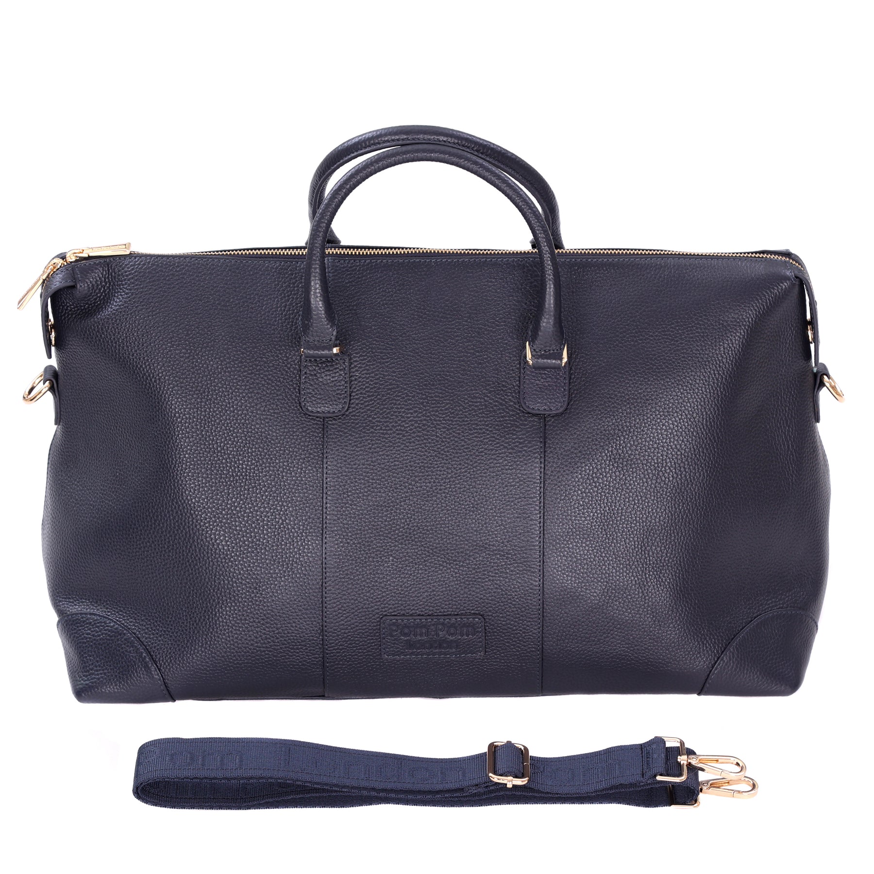 Introducing the Pom Pom London Weekend Bag in Navy. Made from lined pebble grain leather, it features soft top roll handles and a detachable fabric crossbody strap. This is the ultimate leather weekend bag for a trip to the gym, a night away, or a weekend visit.