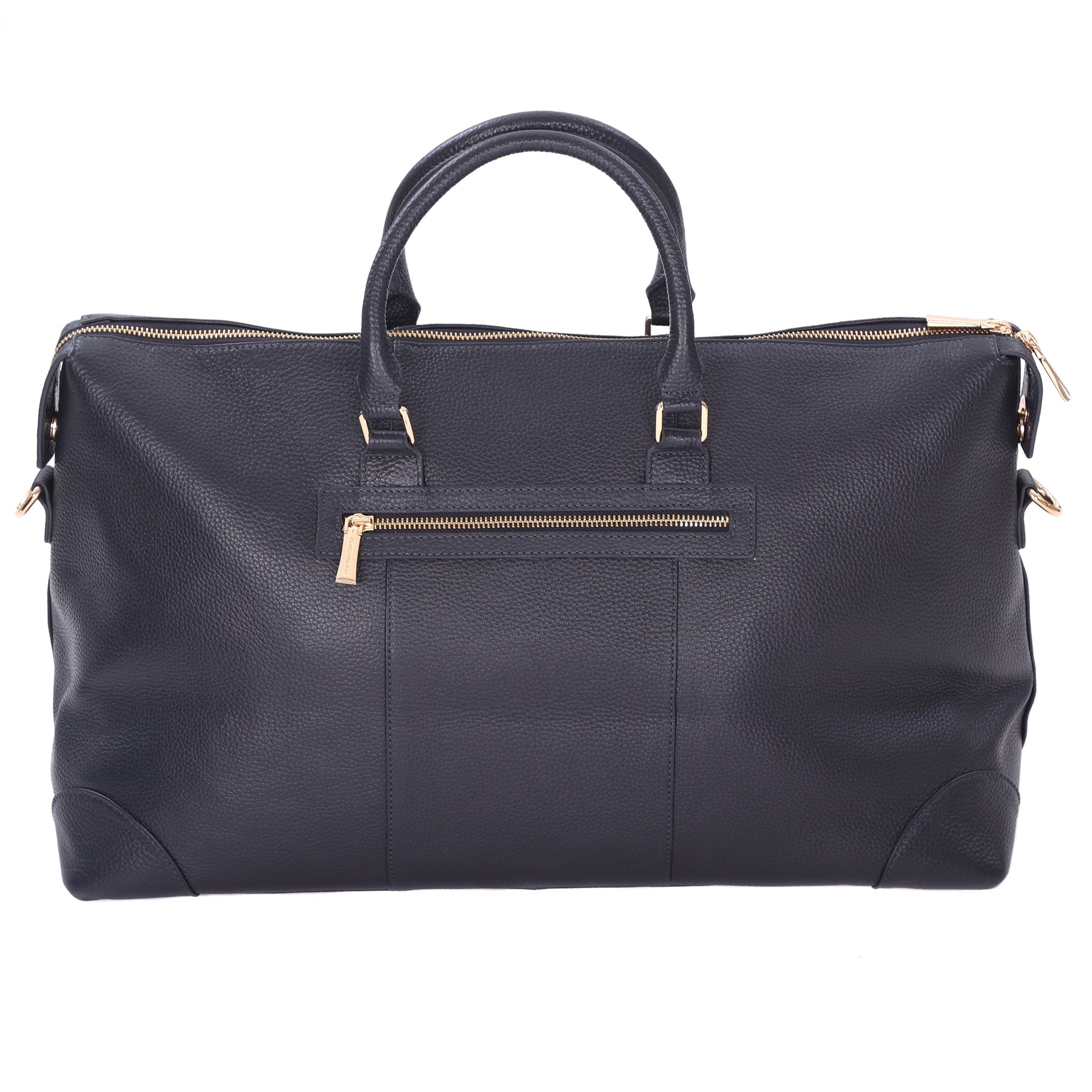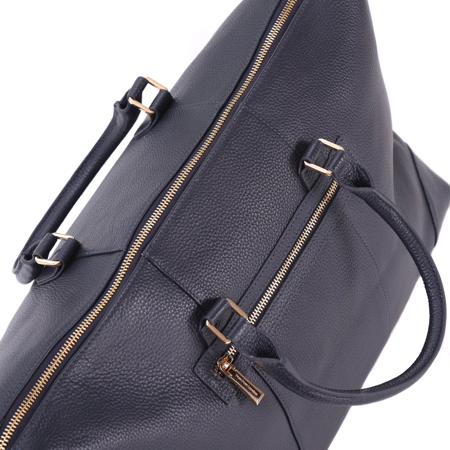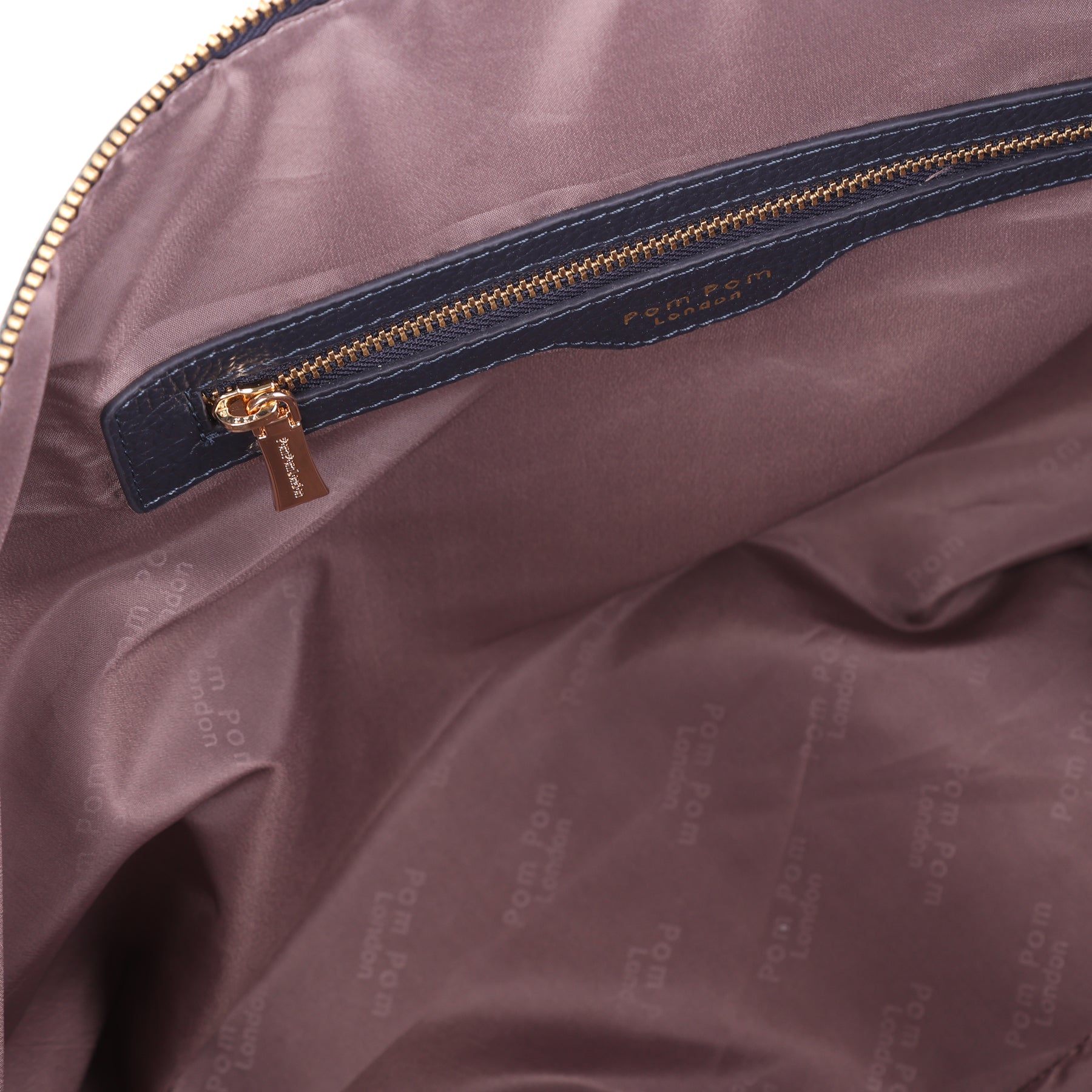 Introducing the Pom Pom London Weekend Bag in Navy. Made from lined pebble grain leather, it features soft top roll handles and a detachable fabric crossbody strap. This is the ultimate leather weekend bag for a trip to the gym, a night away, or a weekend visit.
