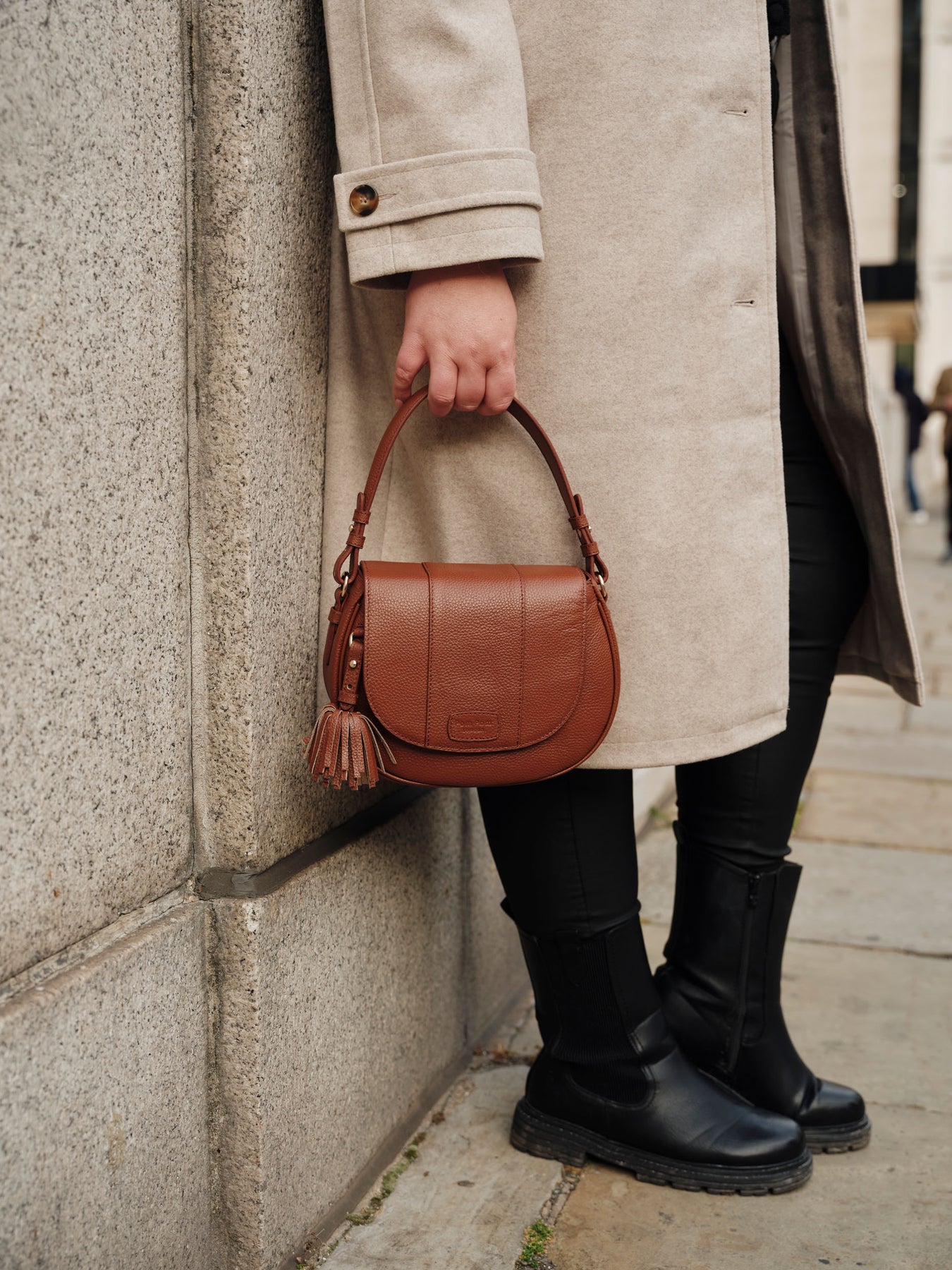 A modern classic, designed for effortless everyday wear. With its softly structured silhouette, tactile leather finish, and subtle tassel detail, it brings a relaxed elegance to any look. Compact yet practical, it’s finished with an adjustable strap for hands-free ease, making it the ideal companion from morning errands to evening plans.