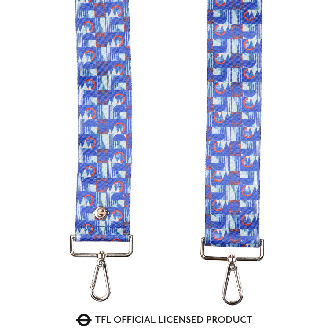 The Piccadilly Line Strap features a distinctive navy base with a vibrant red and blue geometric pattern.