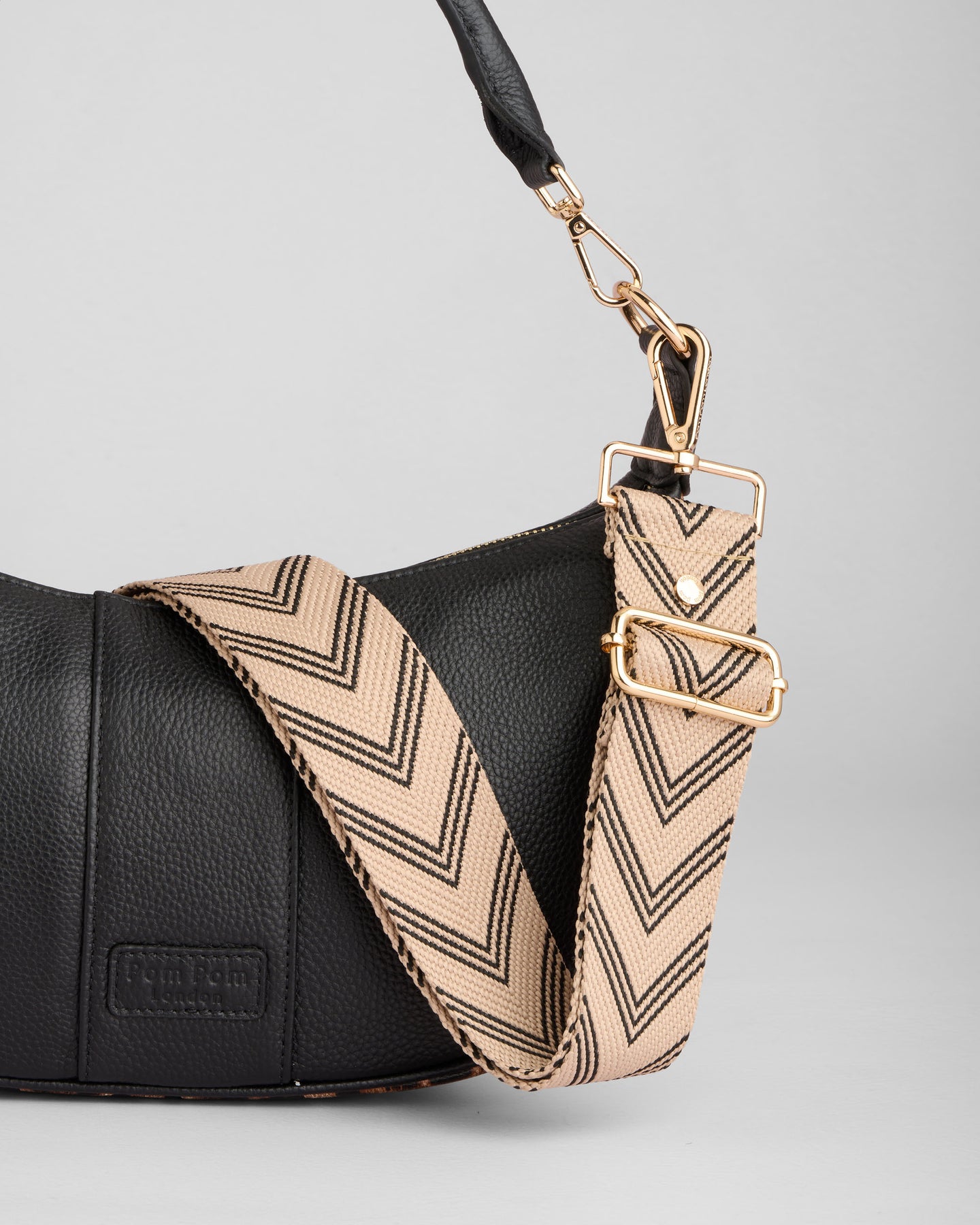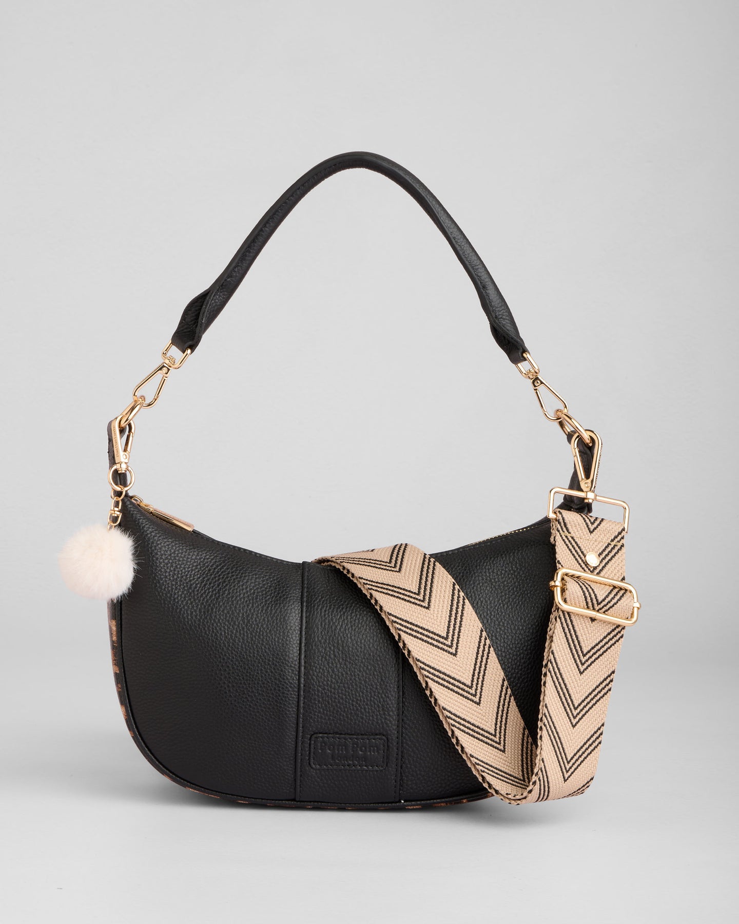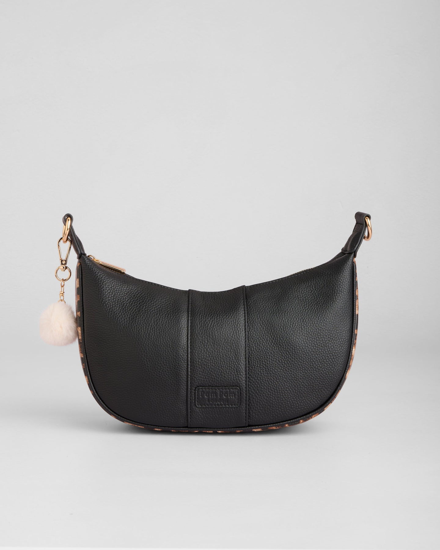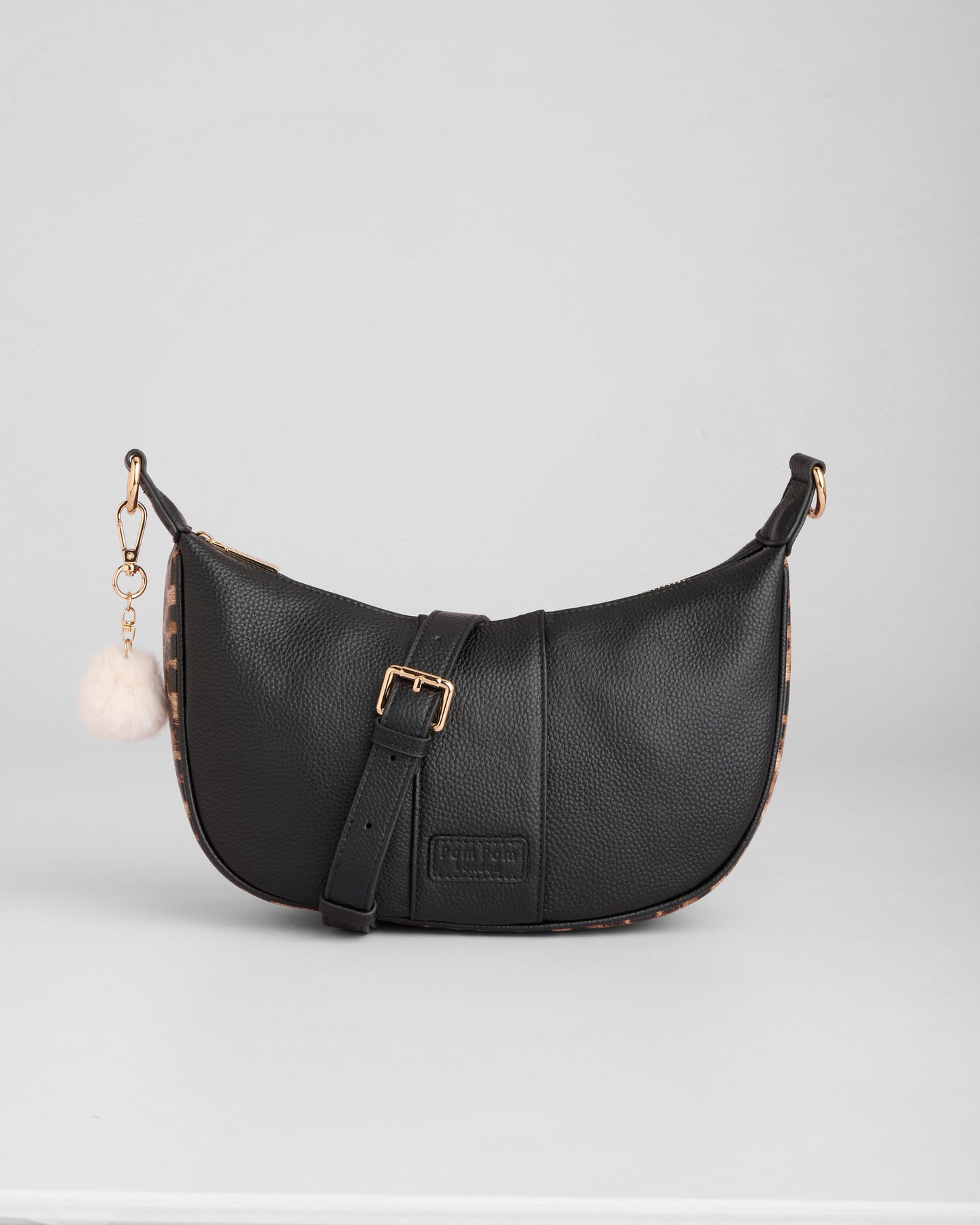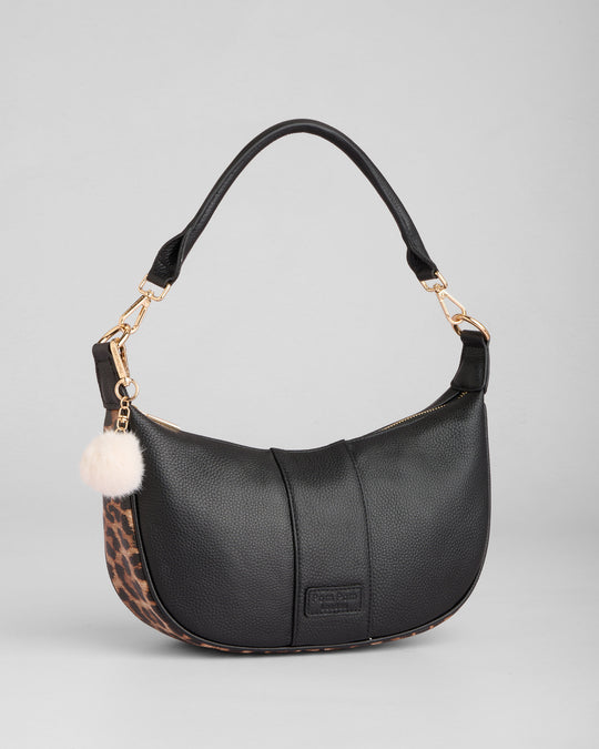 The Sutton Sling in Leopard Print Black features subtle leopard print detailing on the base, adding a statement touch to the classic crescent style.