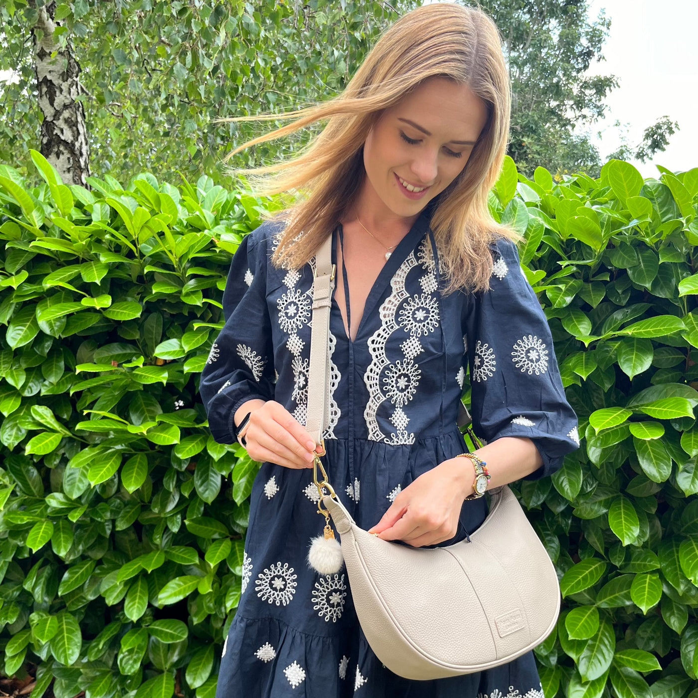 I bought the Lime Green Pom Pom bag with two additional canvas straps and I love it so much I went and bought the tan one too. The three zip pockets on the outside allow easy access to phone, keys and then the bigger central pocket is big enough for a purse, sunglasses and still has room for more. I love it.